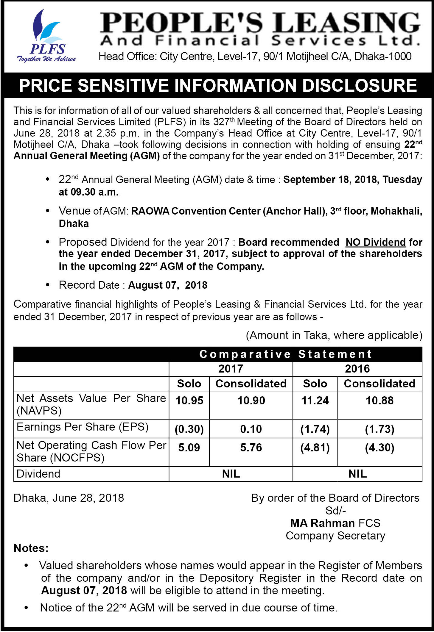 Price Sensitive information Disclosure of Peoples Leasing and Financial Services Ltd