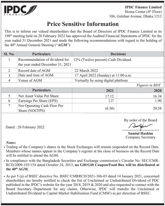 Price Sensitive information (Dividend Declaration for the year of 2021) of IPDC