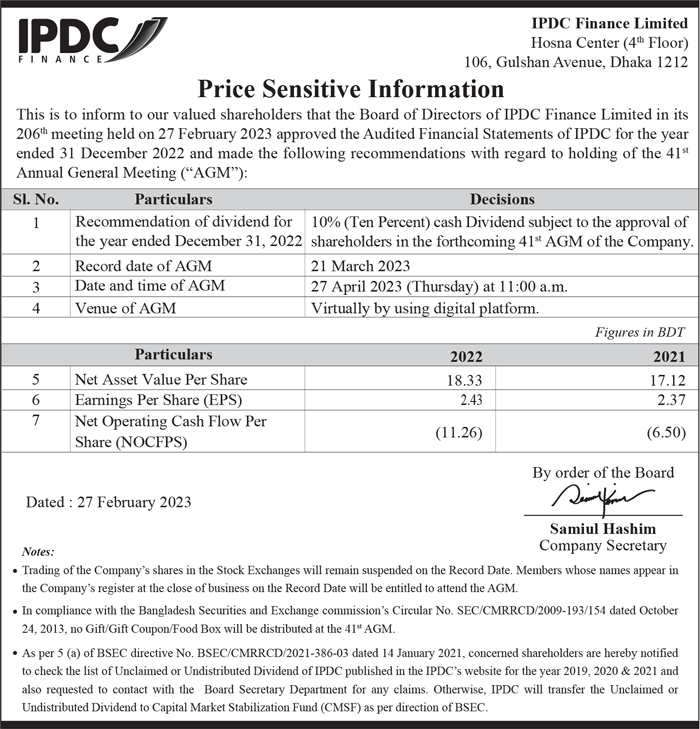 Price Sensitive information (Dividend Declaration for the year of 2022) of IPDC Finance Ltd.