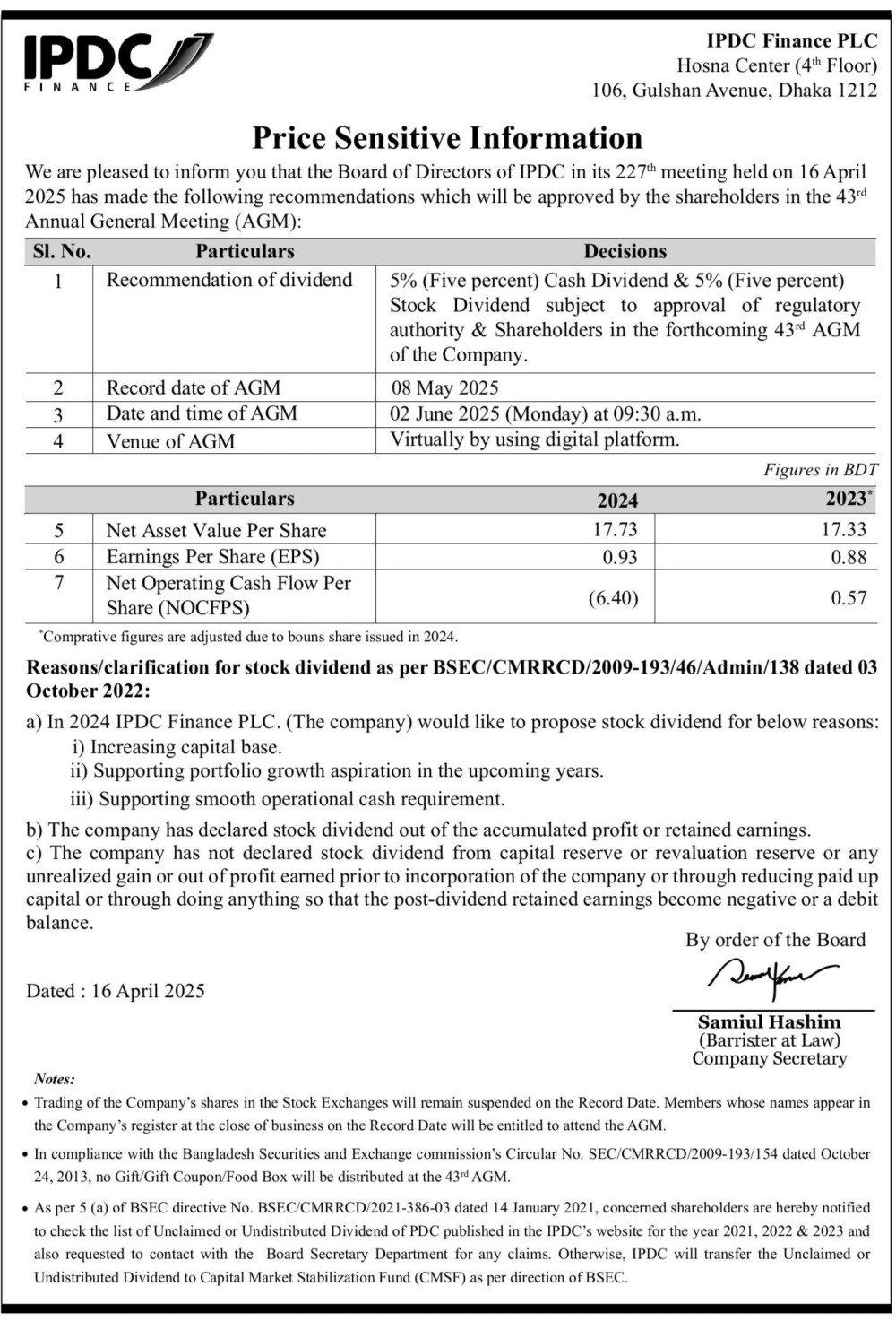 Price Sensitive information (Dividend Declaration for the year of 2024) of IPDC Finance PLC