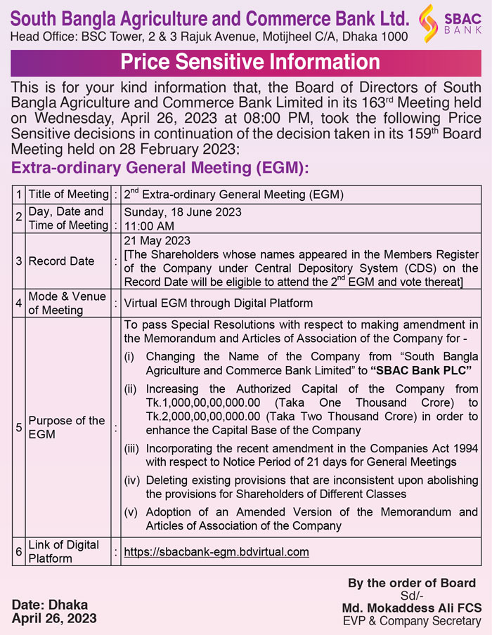 Price Sensitive Information (EGM) of SBAC Bank Limited