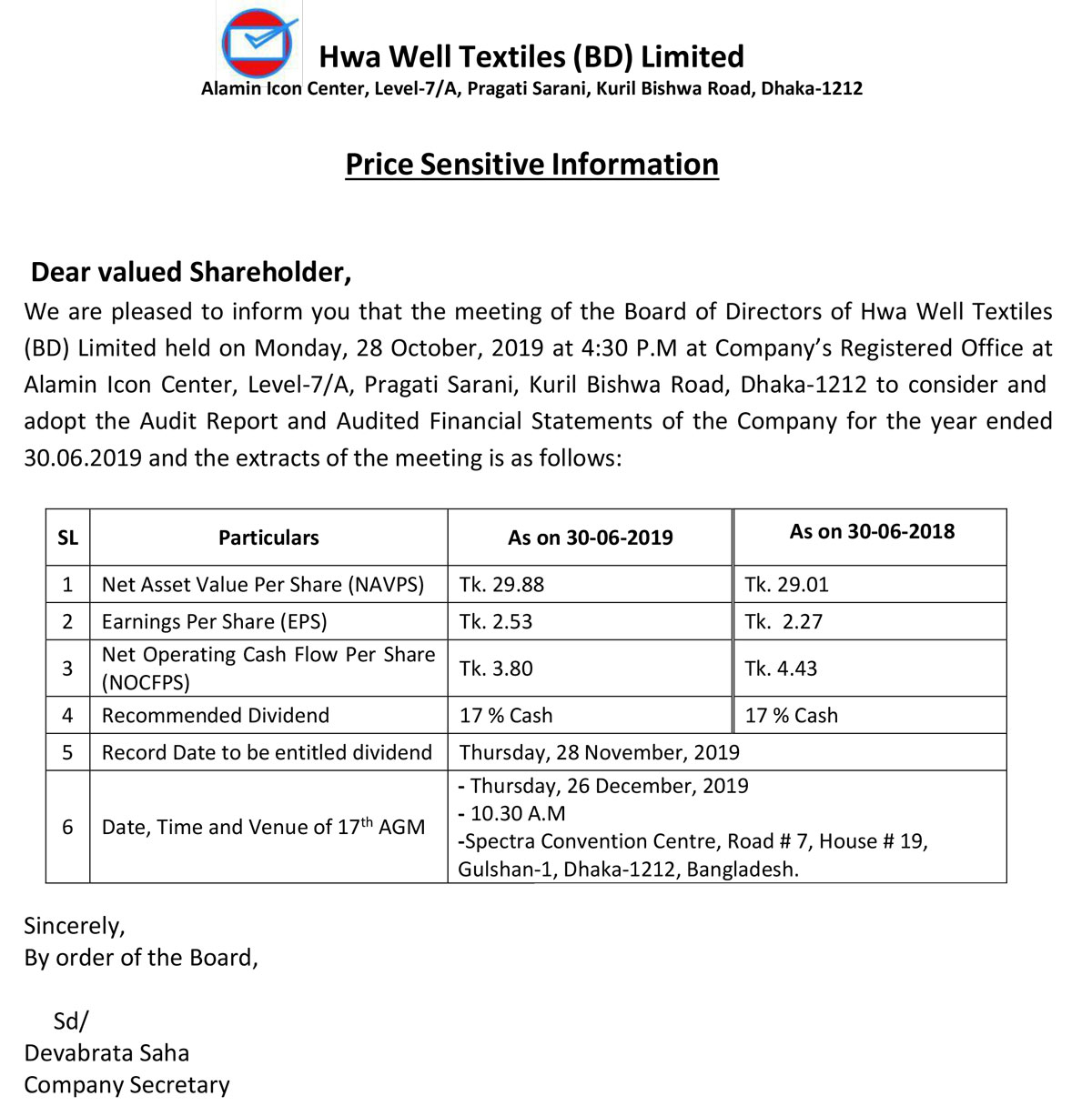 Price Sensitive Information Hwa Well Textiles (BD) Limited