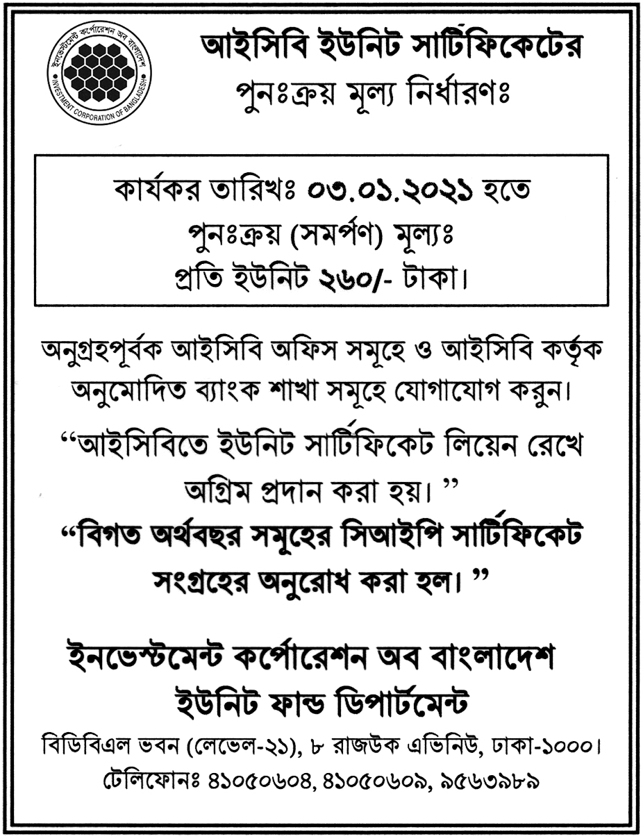 আইসিবি ইউনিট সার্টিফিকেটের পুনঃক্রয় মূল্য নির্ধারণ