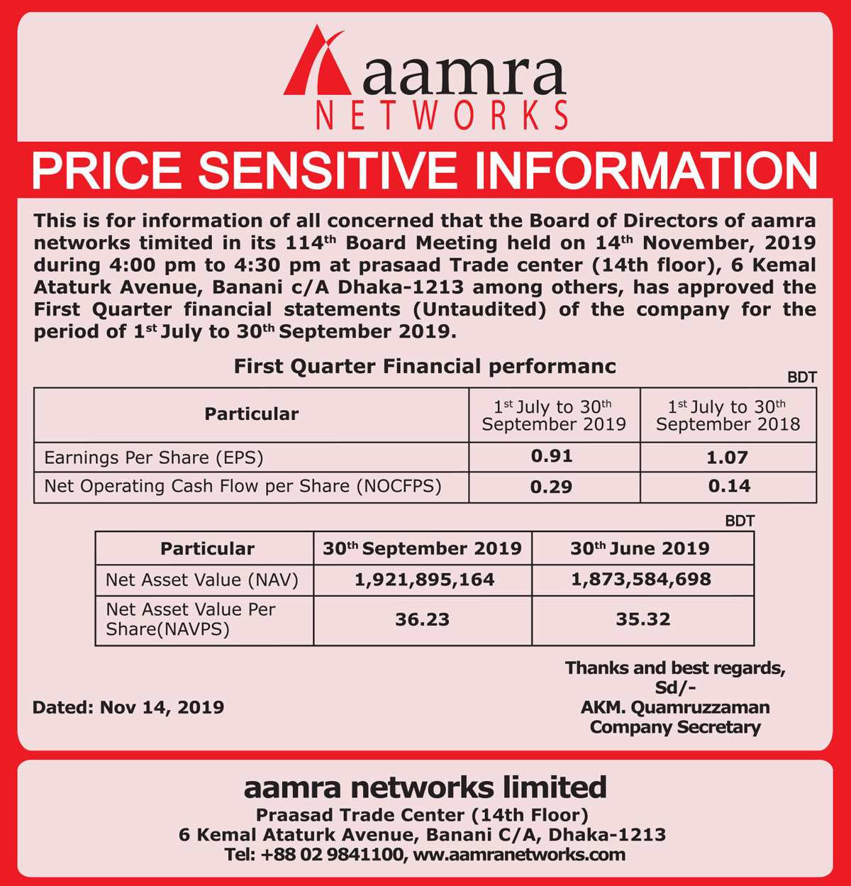 Disclosure of Price Sensitive Information of Aamra Networks Limited