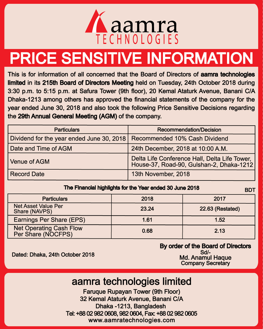 Un-audited Q2 Financial Statements of Aamra technologies limited