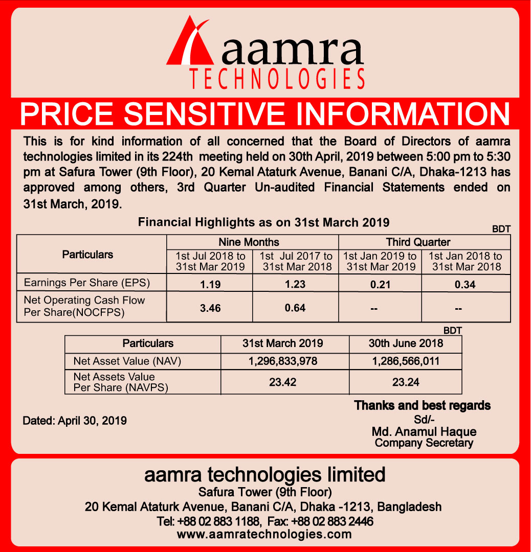 Q1 Financial Statements (Un-audited) of Aamra technologies limited