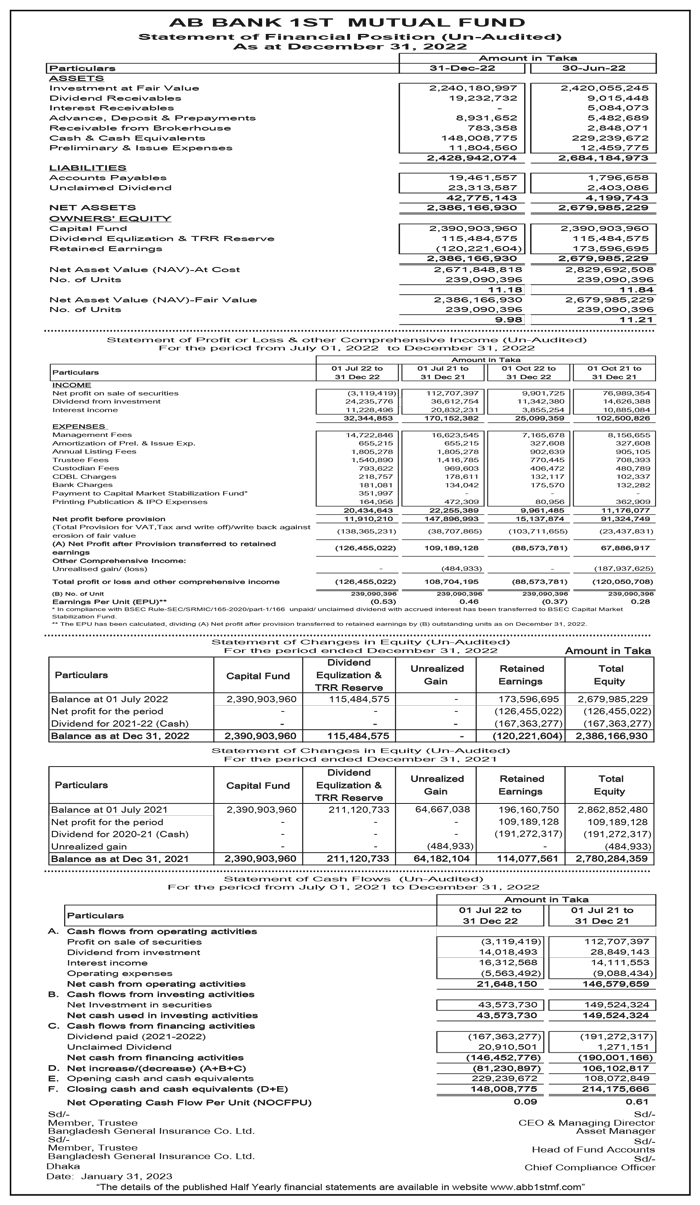 Un-audited Statements of Financial Position of AB Bank 1st Mutual fund