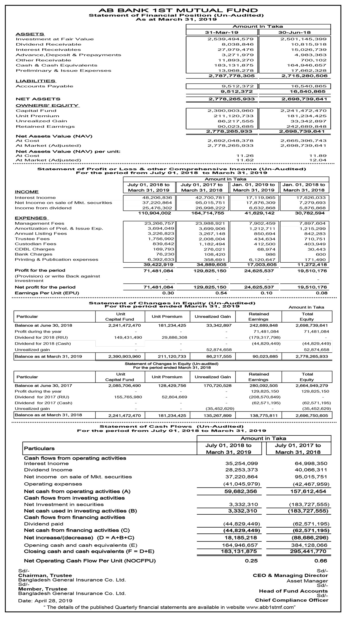 Un-audited Statements of Financial Position of AB Bank 1st Mutual fund