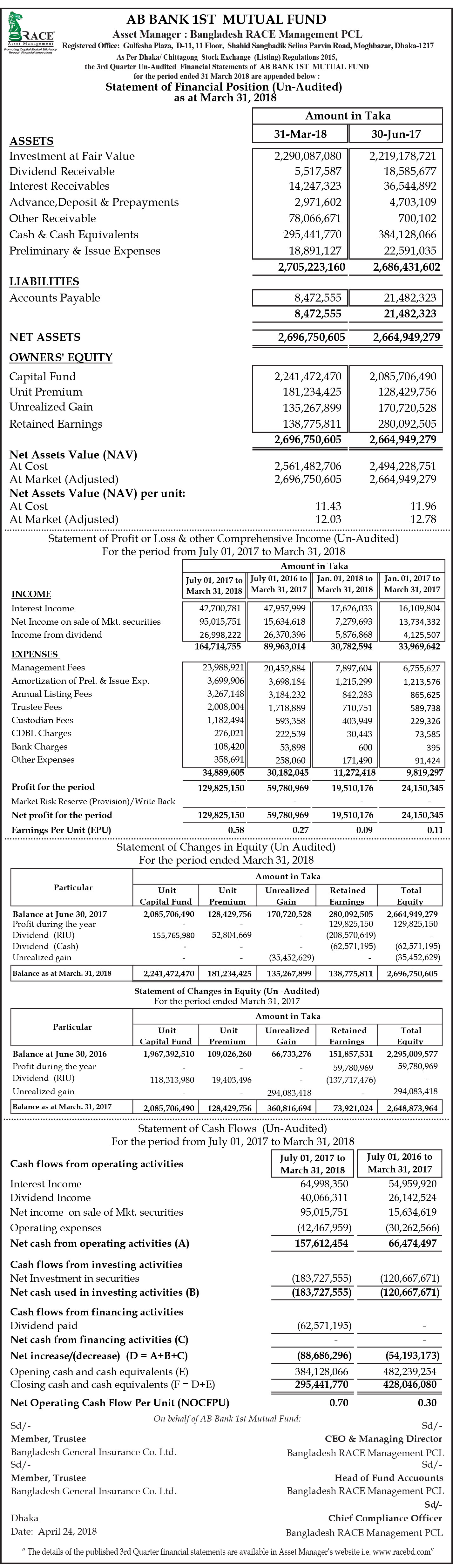 Un-audited Statements of Financial Position of AB Bank 1st Mutual fund
