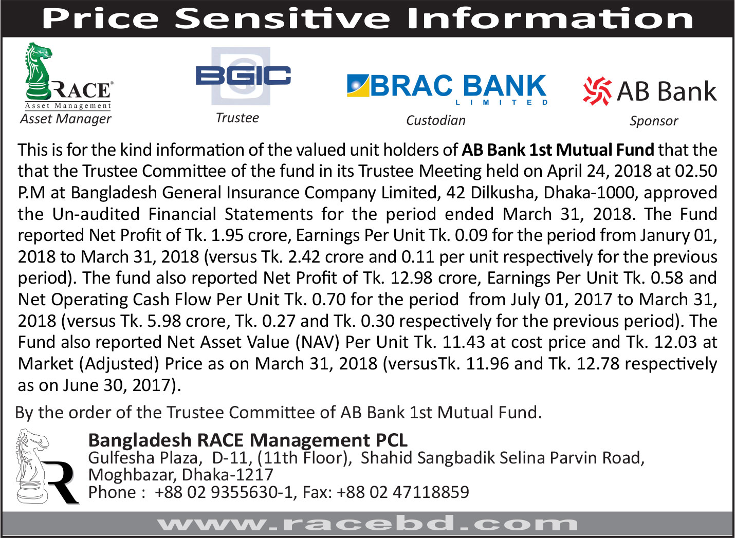 Price Sensitive Information of AB Bank 1st Mutual Fund