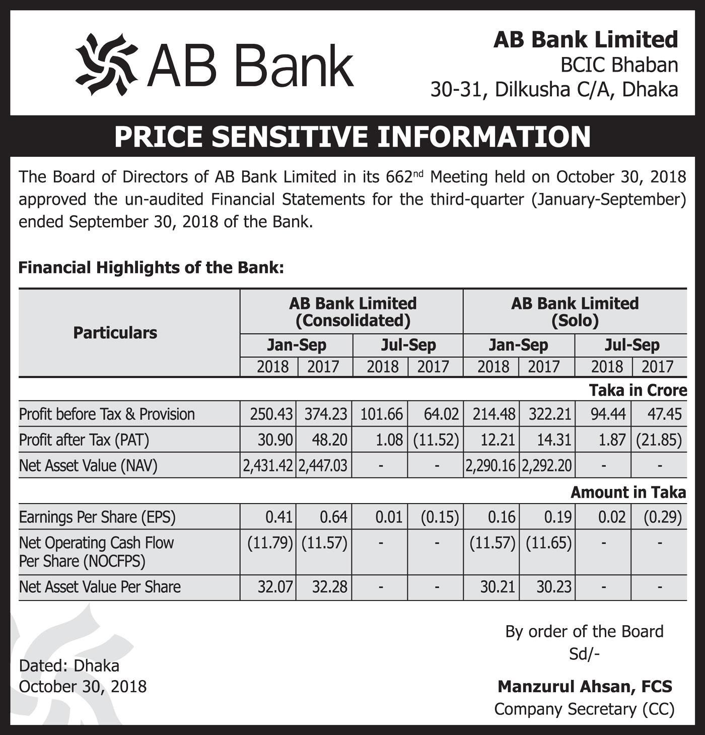 Un-audited Financial Statements of AB Bank PLC. & its Subsidiaries