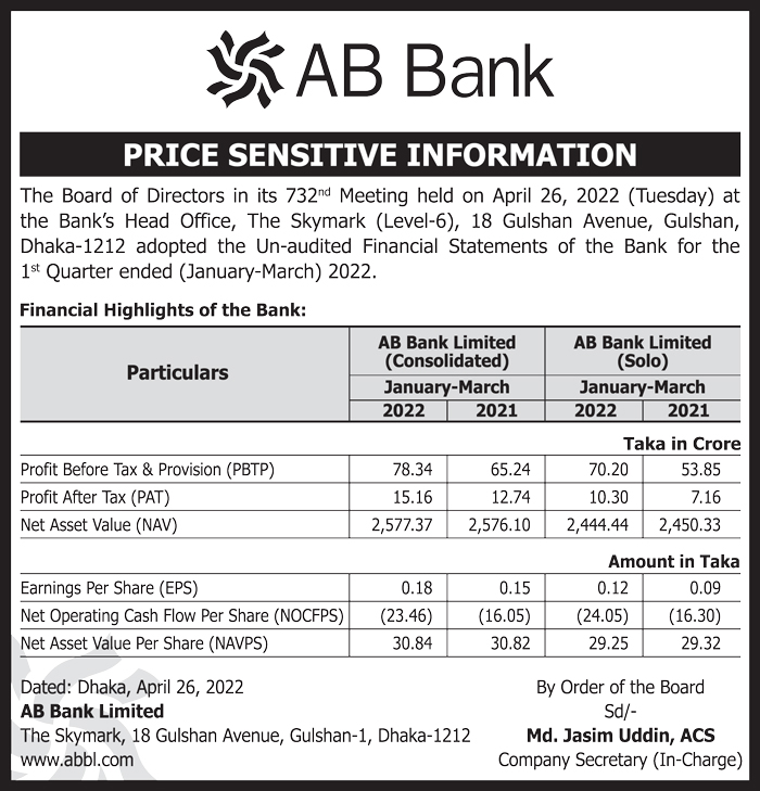 Un-audited Financial Statements of AB Bank PLC. & its Subsidiaries