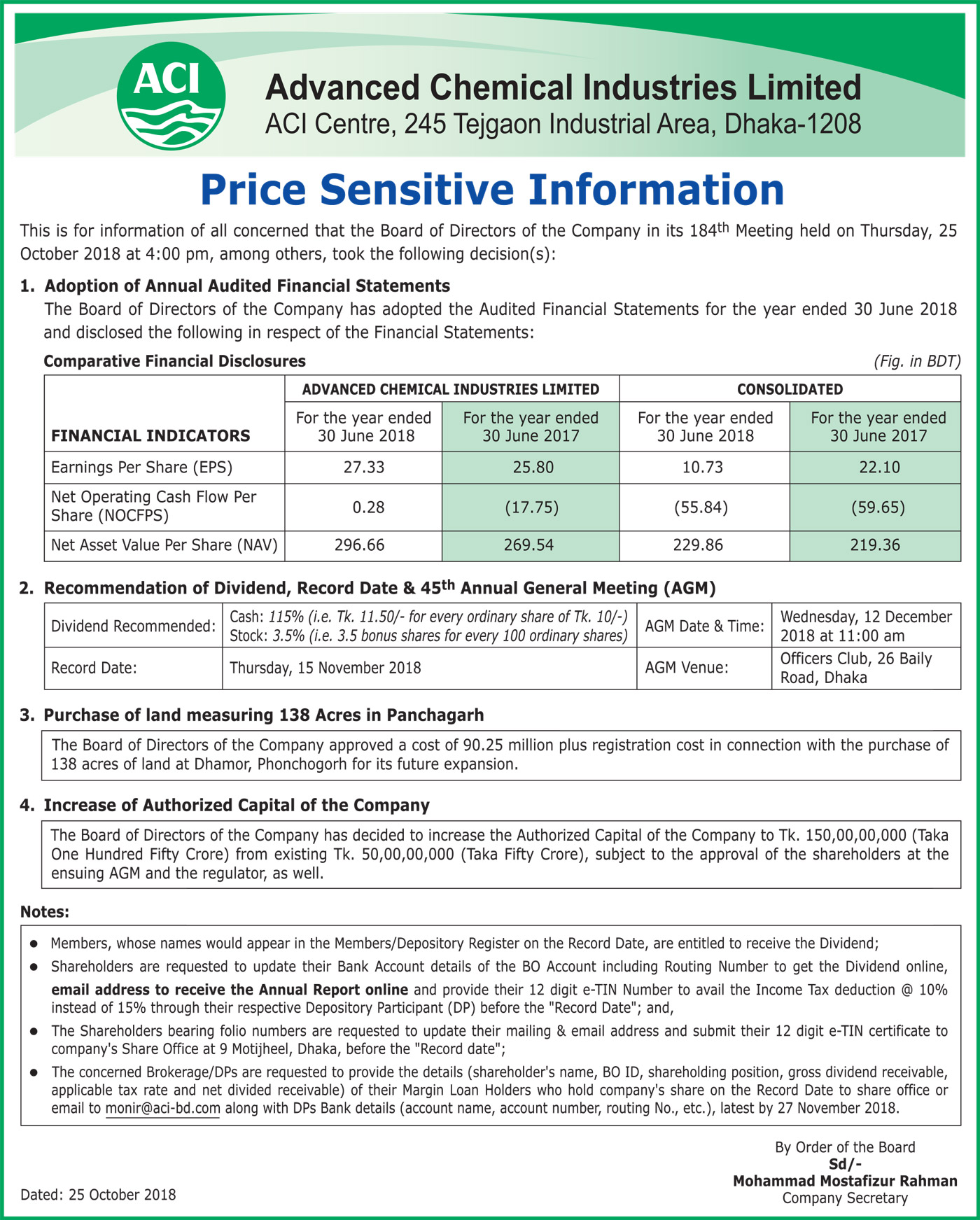 Q3 Un-audited Financial Statements of Advanced Chemical Industries PLC (ACI)