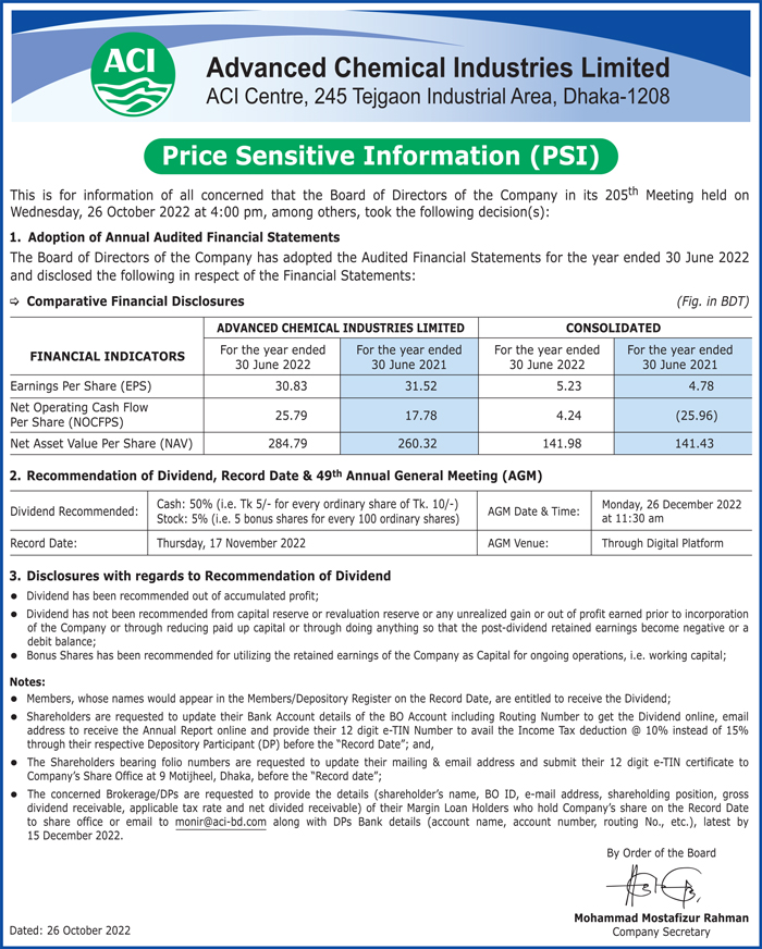 Price Sensitive Information of ACI Limited