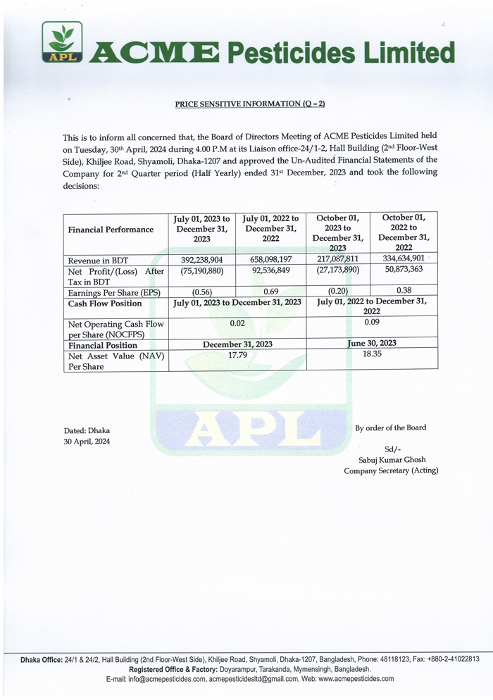 Price Sensitive Information (Q2) of Acme Pesticides Limited