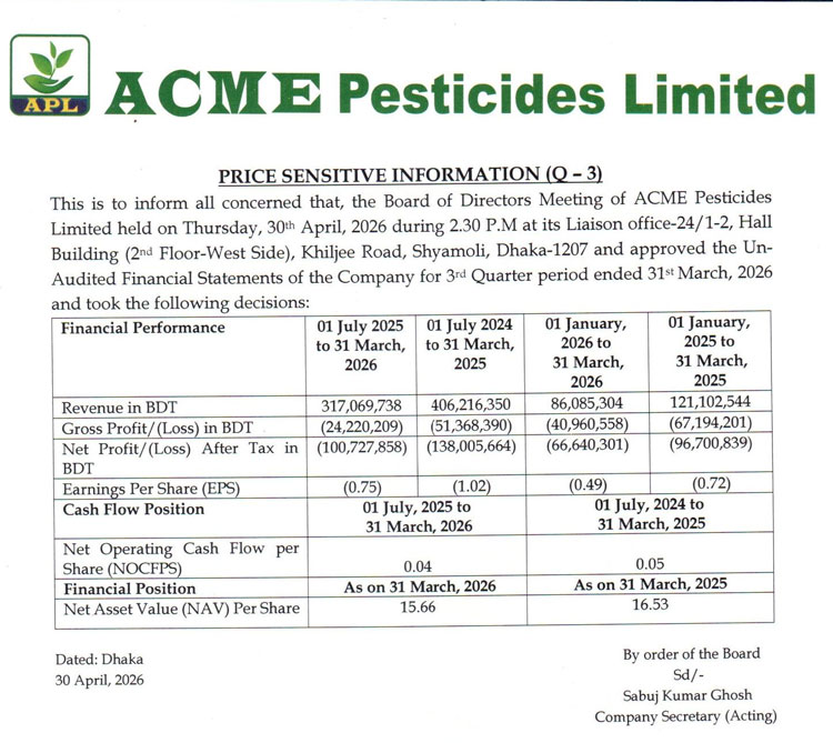 Price Sensitive Infomation of Acme Pesticides Limited