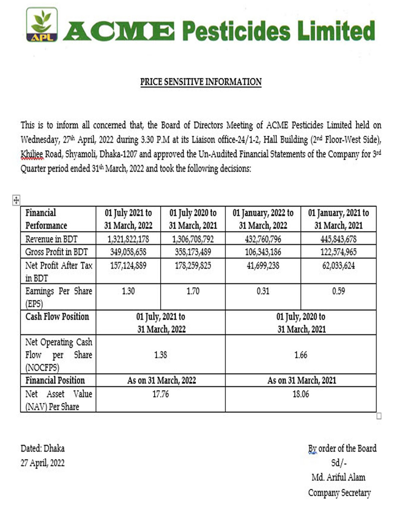 Price Sensitive Information (Q3) of Acme Pesticides Limited