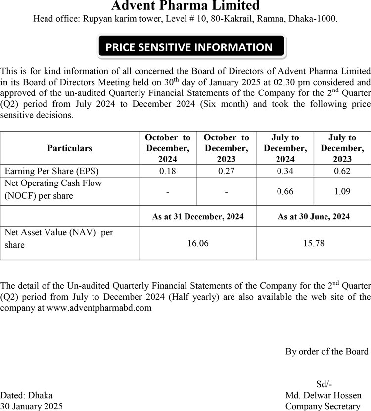 Price Sensitive Information of Advent Pharma Limited