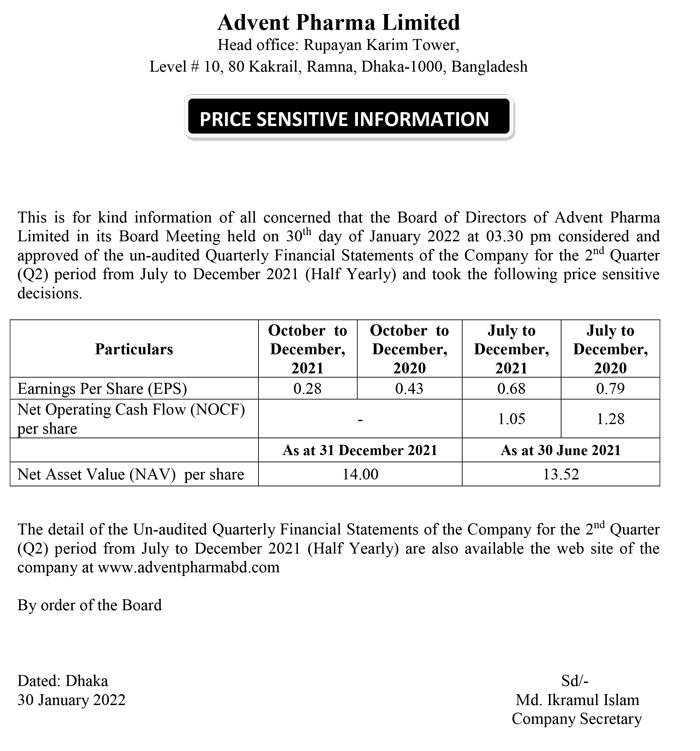 Price Sensitive Information of Advent Pharma Limited