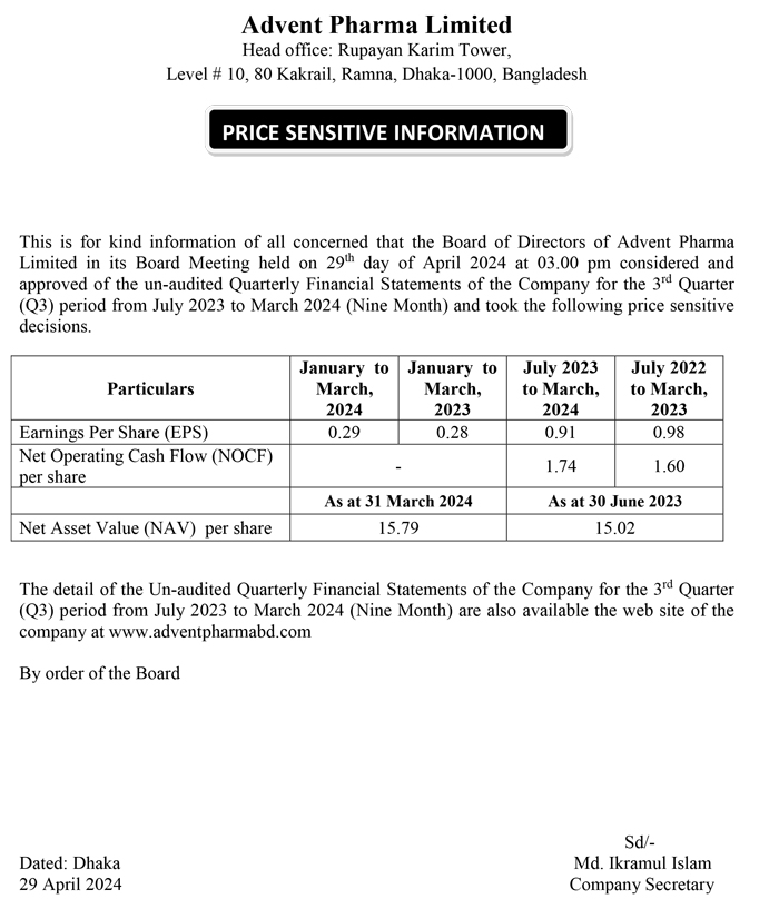 Price Sensitive Information of Advent Pharma Limited