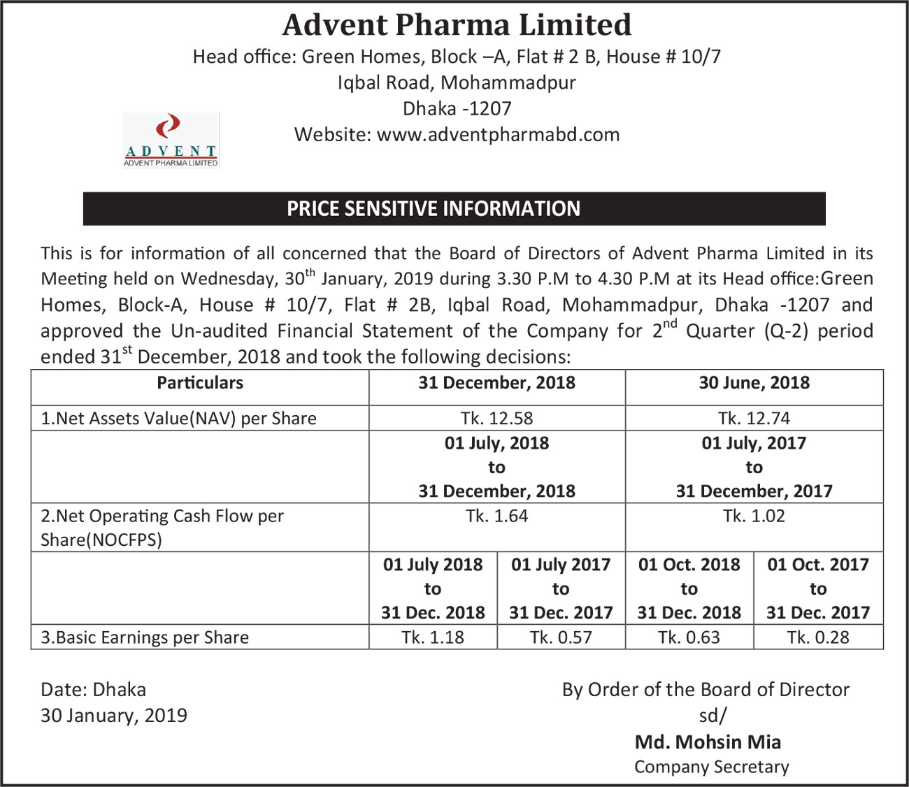 Price Sensitive Information of Advent Pharma Limited