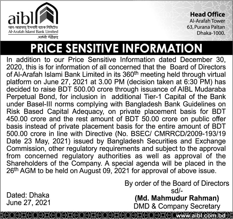 Price Sensitive Information of Al-Arafah Islami Bank Limited
