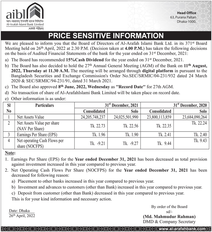 Price Sensitive Information of Al-Arafah Islami Bank Limited