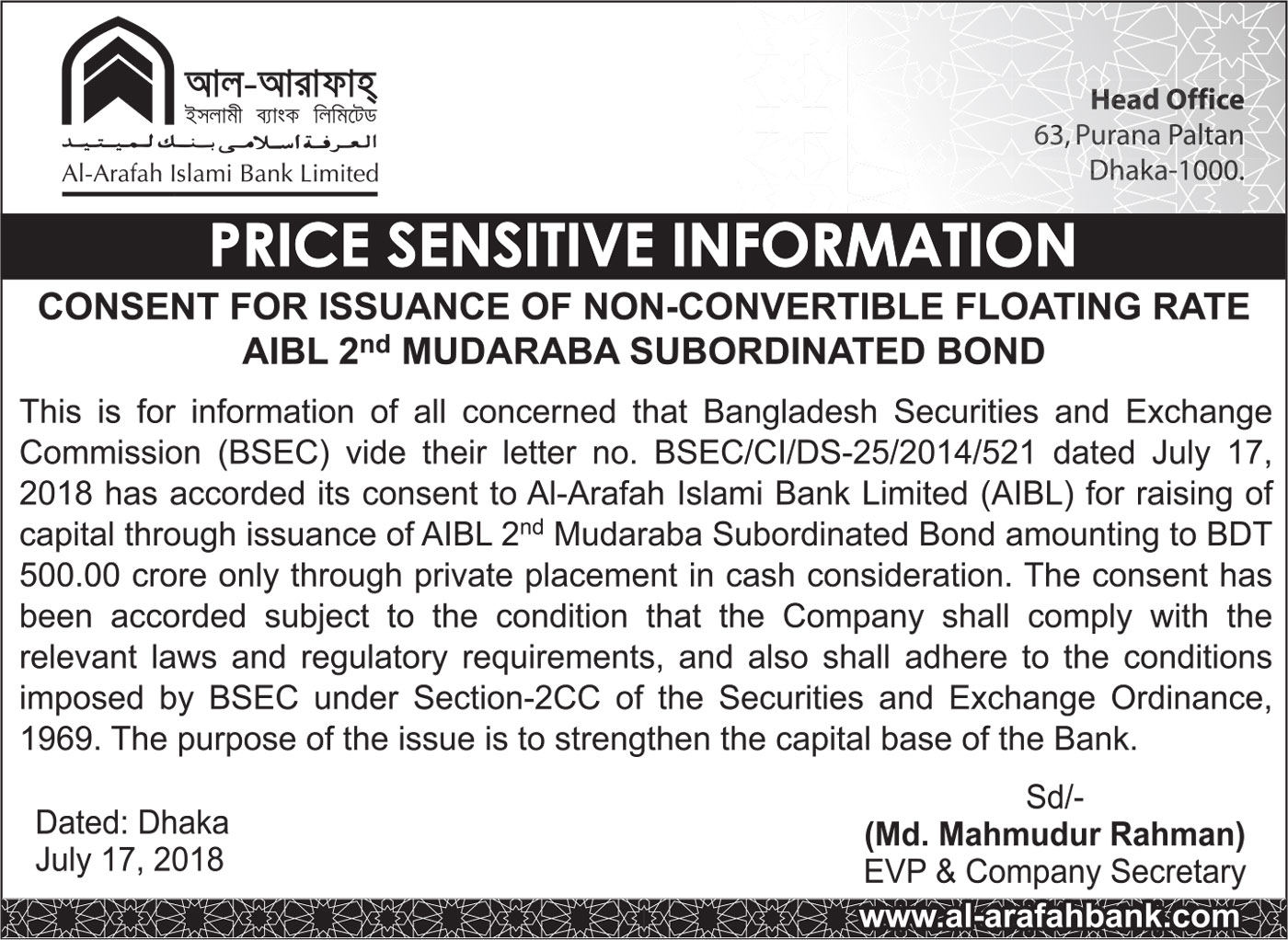Price Sensitive Information of Al-Arafah Islami Bank Limited