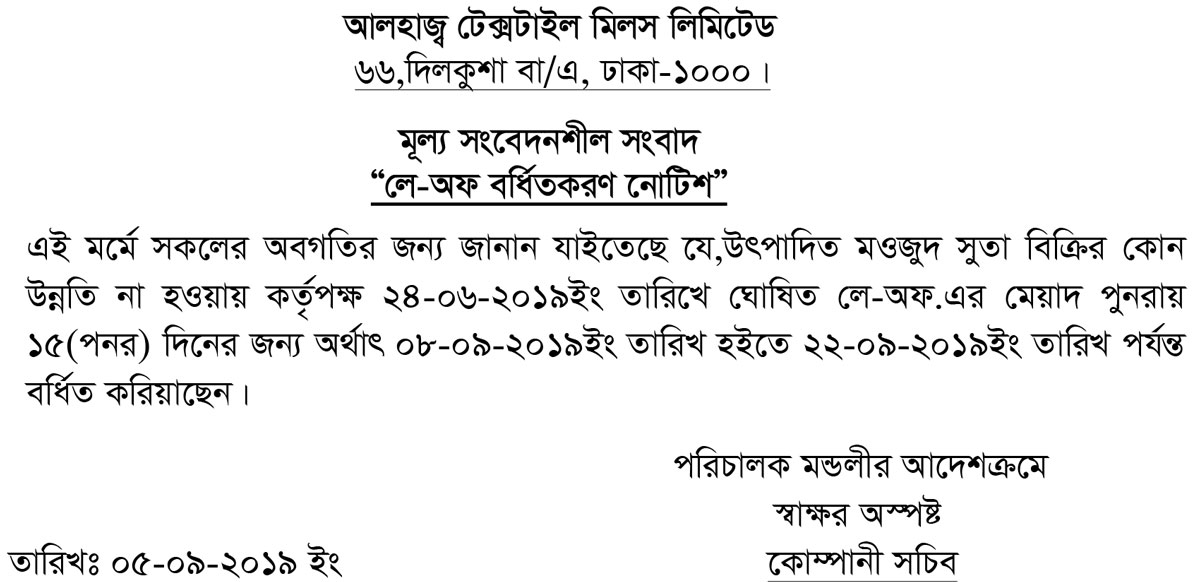 Price Sensitive Information of Alhaj Textile Mills Ltd