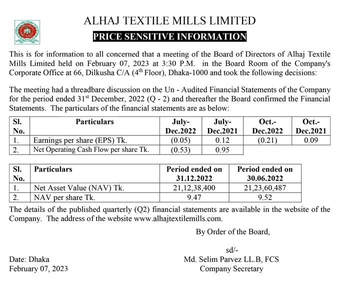 Price Sensitive Information of Alhaj Textile Mills Limited