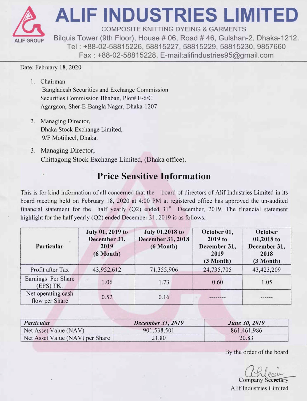 Price Sensitive Information (Q2) of Alif Industries Limited