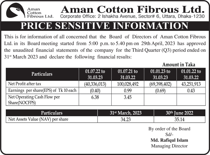 Price Sensitive Information of Aman Cotton Fibrous Ltd.