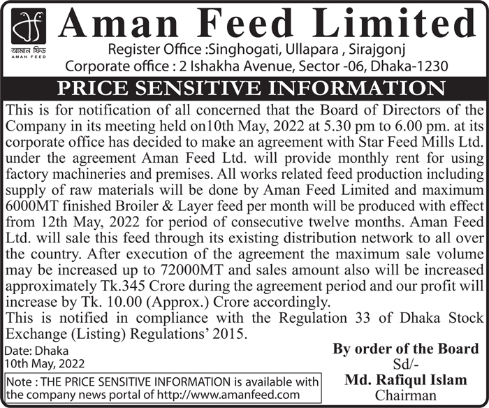 Aman Feed Limited Price Sensitive Information