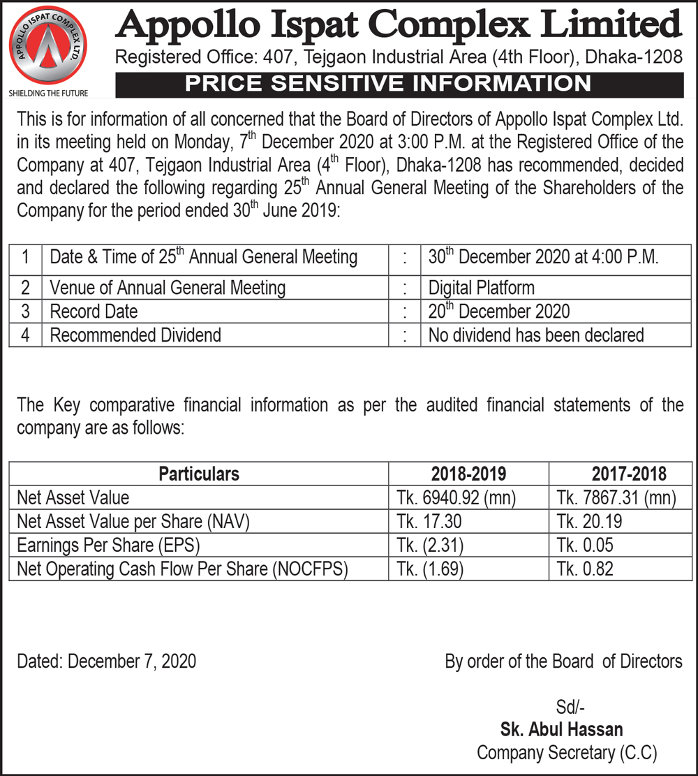 Price Sensitive Information of Appollo Ispat Complex Limited