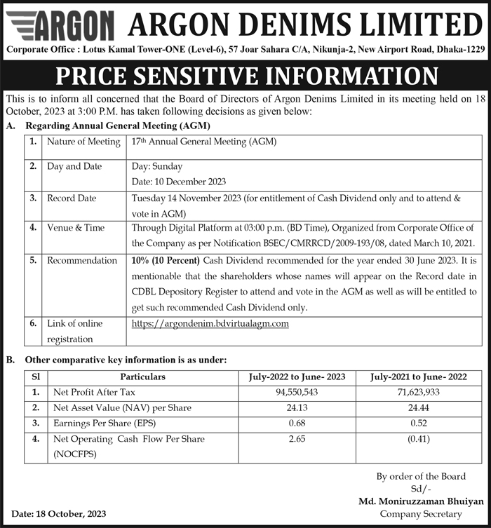 Annual Report Dispatch Noitce of Argon Denims Limited