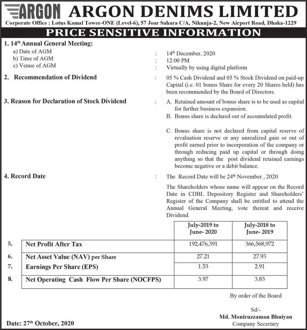 Annual Report Dispatch Noitce of Argon Denims Limited