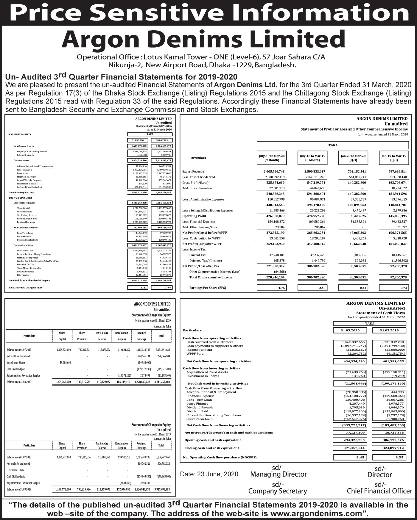 Annual Report Dispatch Noitce of Argon Denims Limited