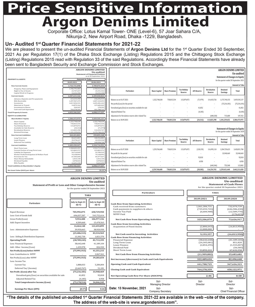 Q2 Un-audited Financial Statements of Argon Denims Limited