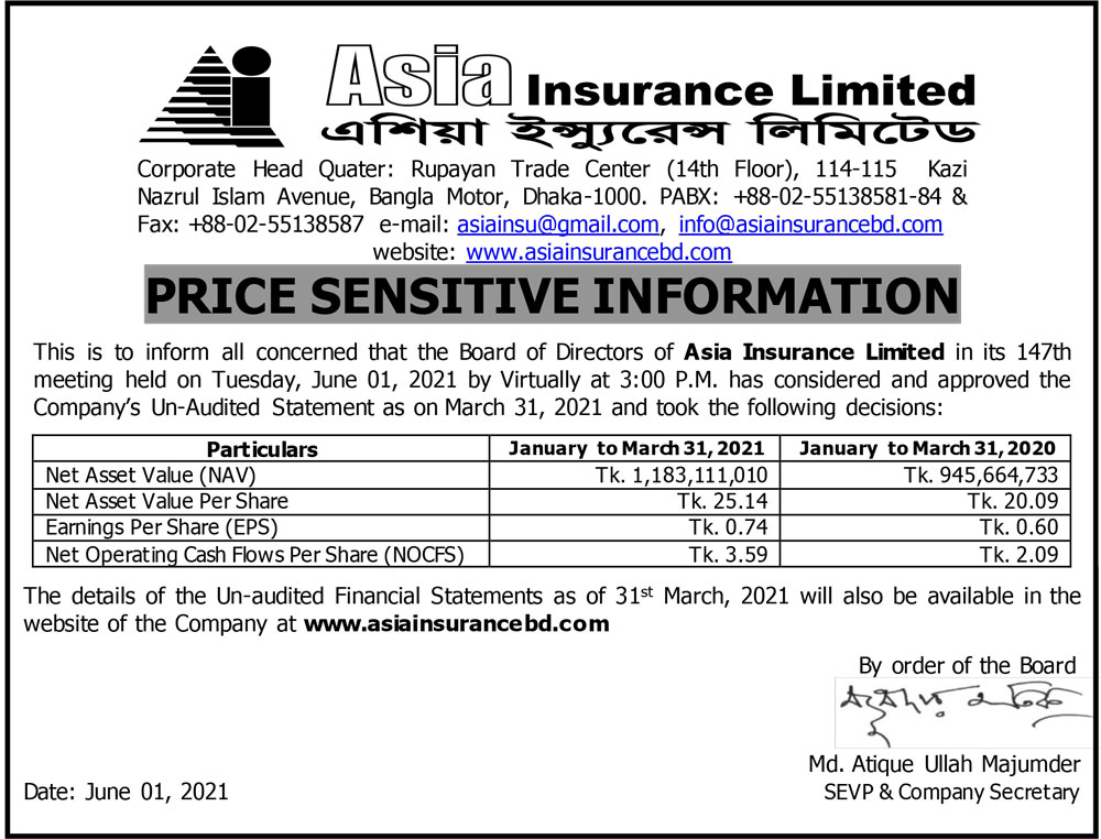 1st Quarterly Financial Statements (Unaudited) of Asia Insurance Ltd.