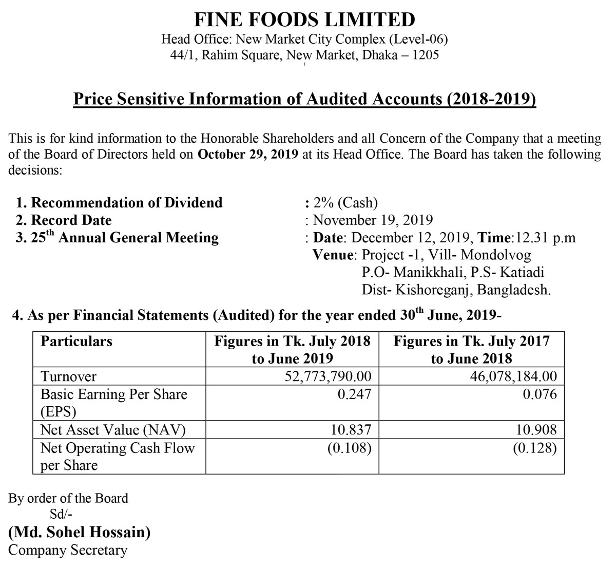 Price Sensitive Information of Audited Accounts of Fine Foods Limited