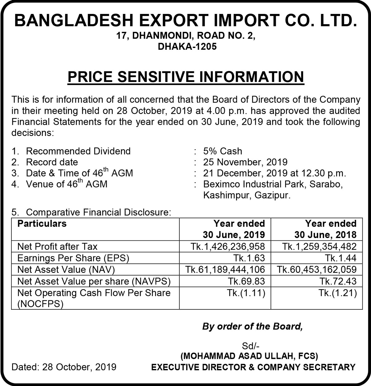 Price Sensitive Information of Bangladesh Export Import Company Limited