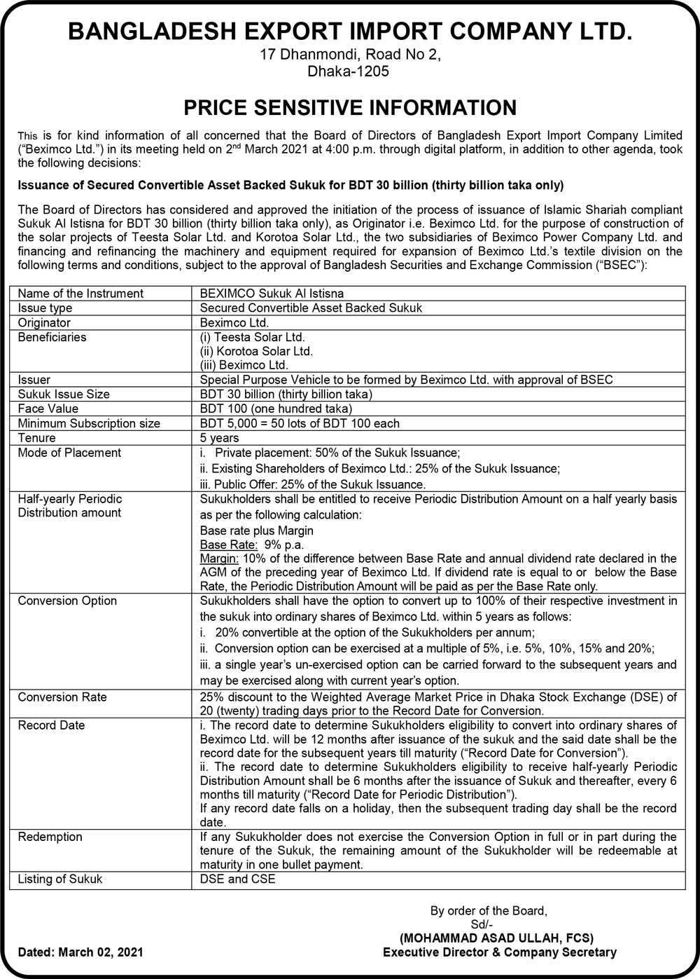 Price Sensitive Information of Bangladesh Export Import Company Limited