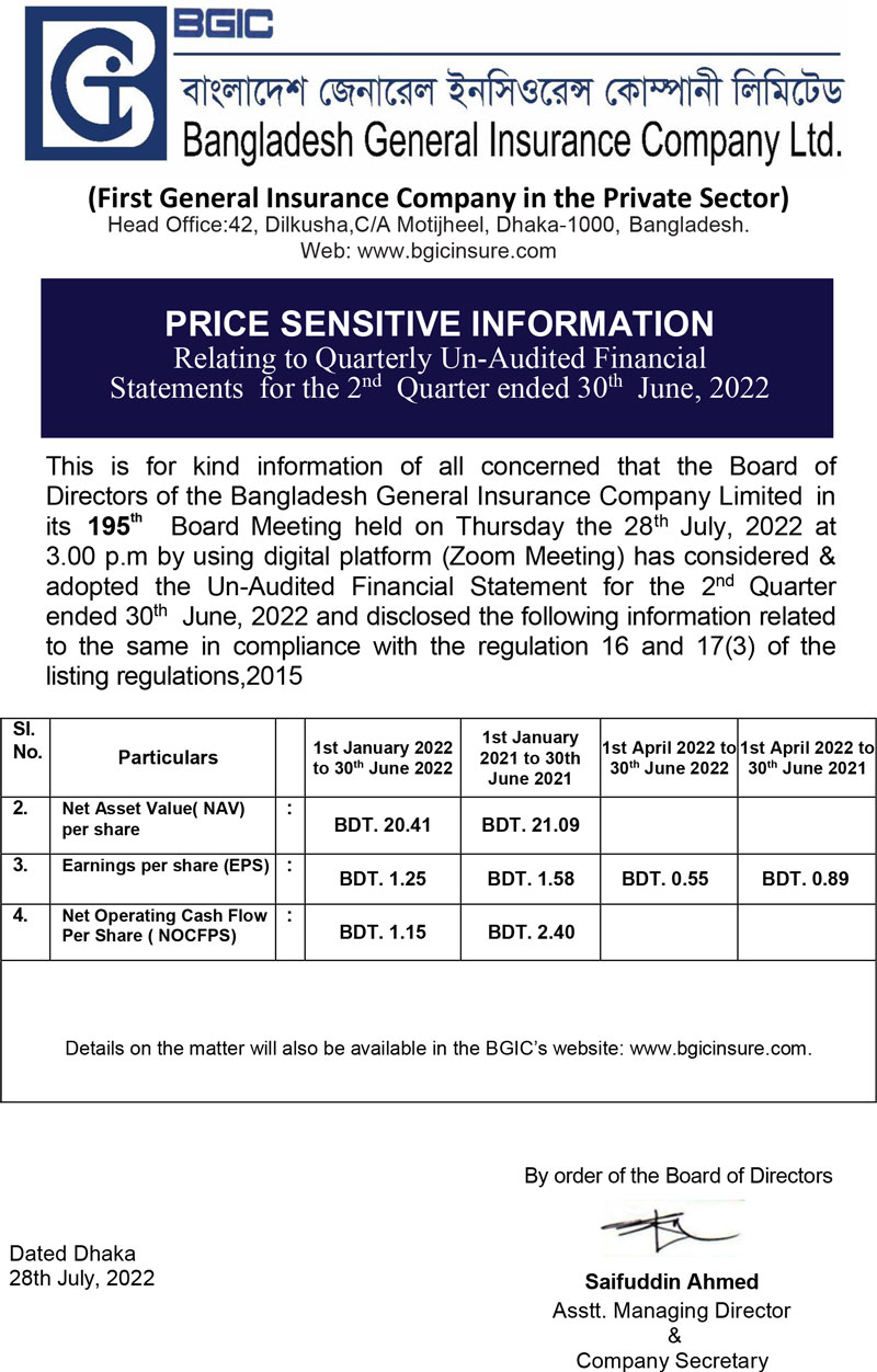 Price Sensitive Information (Q2) of Bangladesh General Insurance Company PLC.