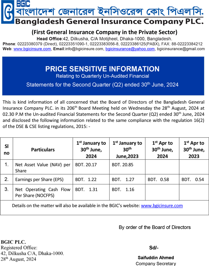 Price Sensitive Information (Q2) of Bangladesh General Insurance Company PLC.