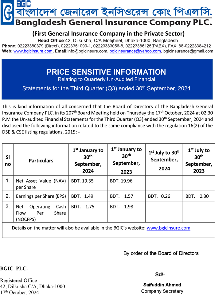 Price Sensitive Information (Q2) of Bangladesh General Insurance Company PLC.