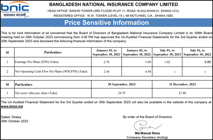 Price Sensitive Information of Bangladesh National Insurance Company Limited