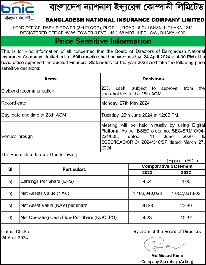 Price Sensitive Information of Bangladesh National Insurance Company Limited