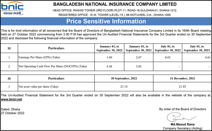 Price Sensitive Information of Bangladesh National Insurance Company Limited