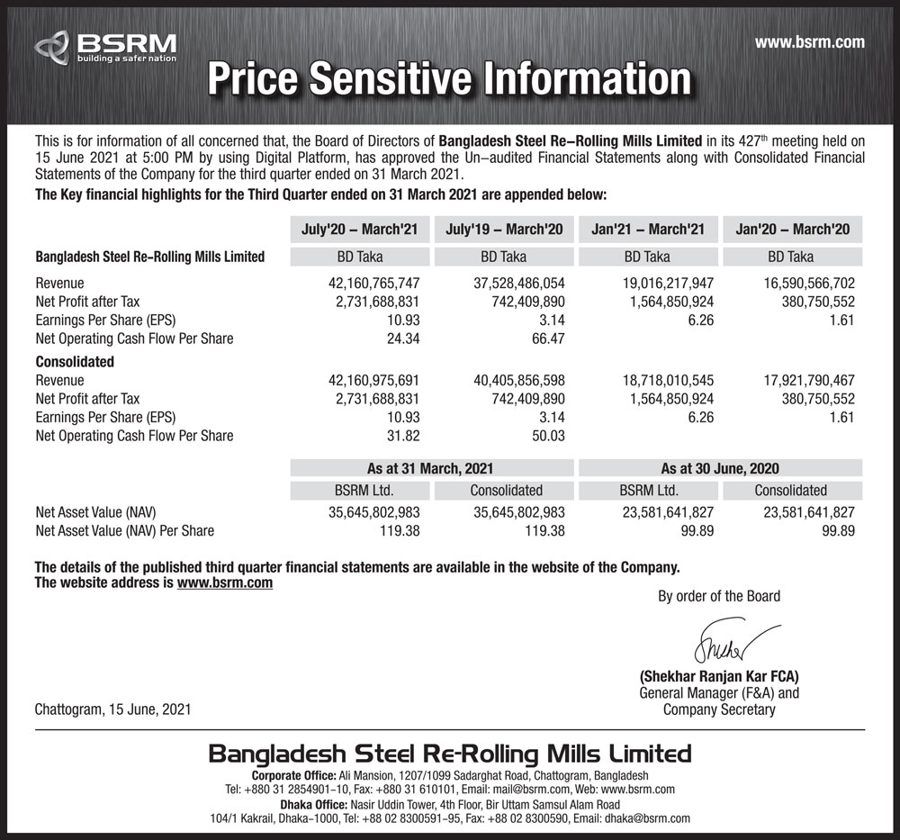 Price Sensitive Information of Bangladesh Steel Re-Rolling Mills Limited