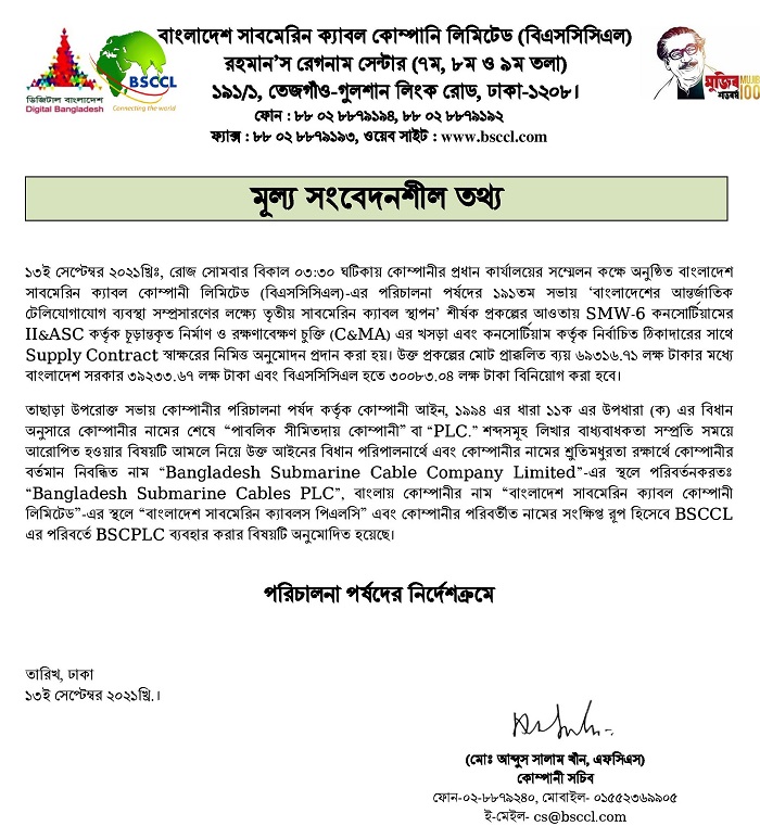 Price Sensitive Information of Bangladesh Submarine Cable Company Limited(BSCCL)